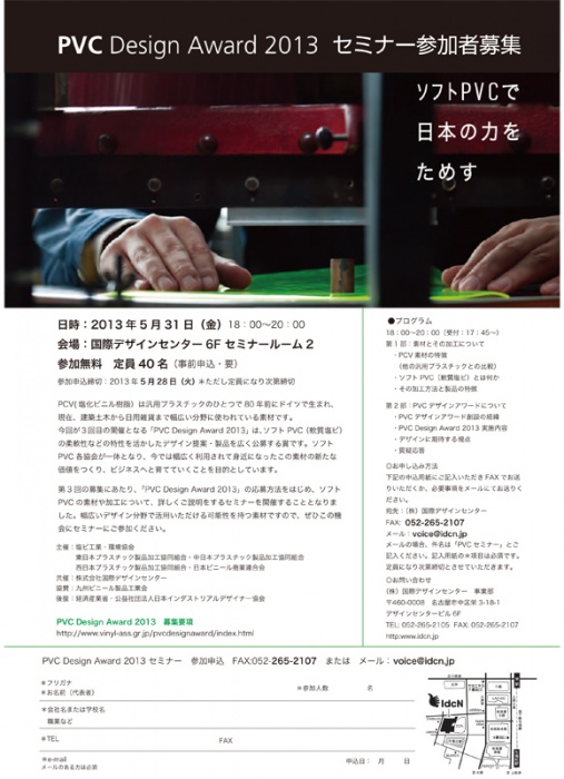 | Co-organaizer(s). etc. | Co-organizer: International Design Center NAGOYA Inc., Sponsor: Kyushu Vinyl Products Industry Association, Supporters: Ministry of Economy, Trade and Industry, Japan Industrial Designer's Association |