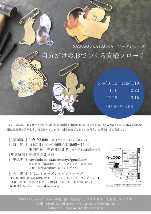 This time, “SAWAKO KATAOKA” will hold a workshop to make a brooch in the shape of a pet’s photo, picture drawn by your child or yourself. Prior to the workshop, the creator cuts a brass in the designated shape based on the image you send in advance, and on the day of the event, you will file, stamp, and attach a pin to complete.