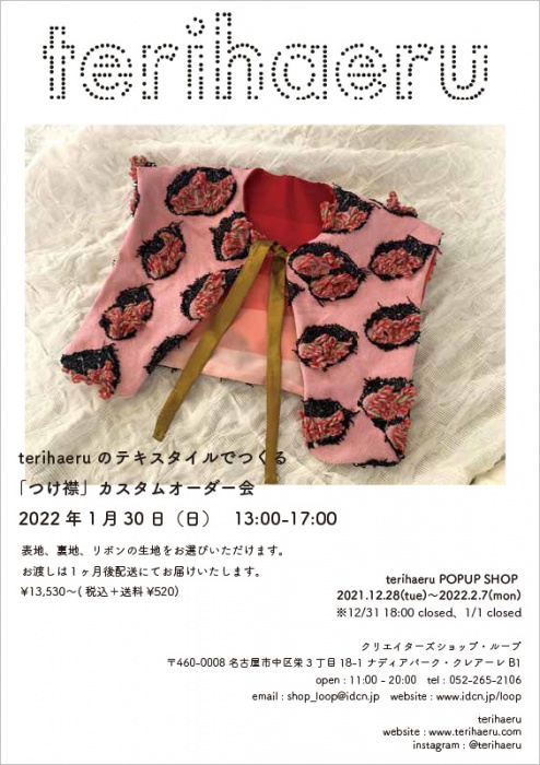This time, “terihaeru” which appears from December 28 to February 7 in the 14th session will hold an order event to make a detachable collar made from its original textiles. You can choose the outer material, lining, and ribbon.