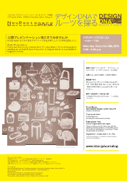 In October of 2008, the City of Nagoya was appointed to UNESCO’s Creative Cities Network of Design. This year’s Workshop is thus our first event as part of this Network. 2008 Workshop participants will include individuals from other appointed UNESCO cities, such as Shenzhen, China; Santa Fe, USA and Aswan, Egypt.