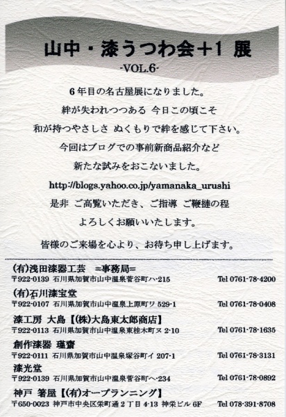 - Exhibition: Yamanaka Urushi (Lacquerware) Utsuwa-kai+1 Vol.6